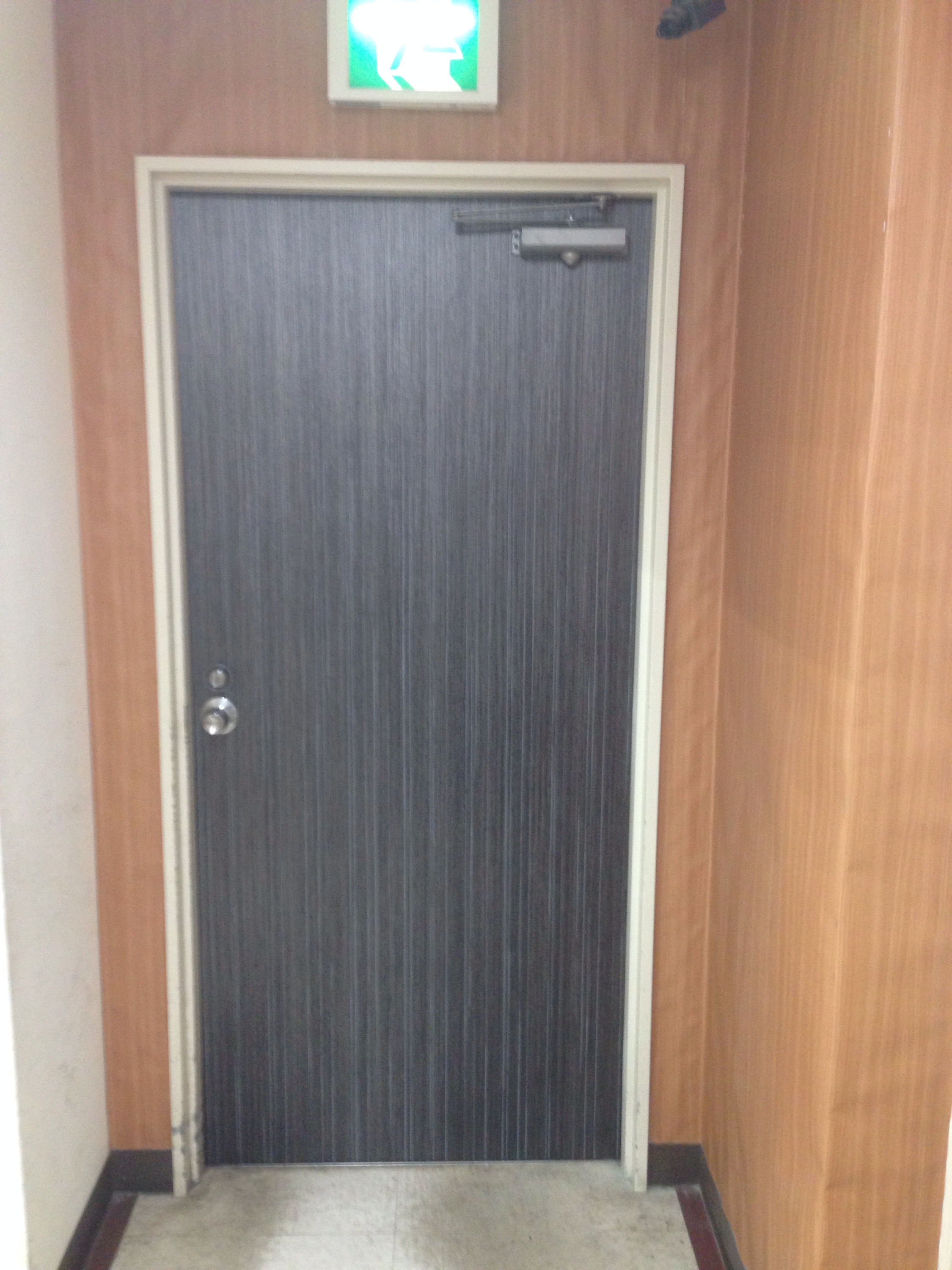 鉄扉にシート貼る事により、模様換えが出来ます。無機質な鉄扉がシックで上品な扉に早変わりです(^o^)